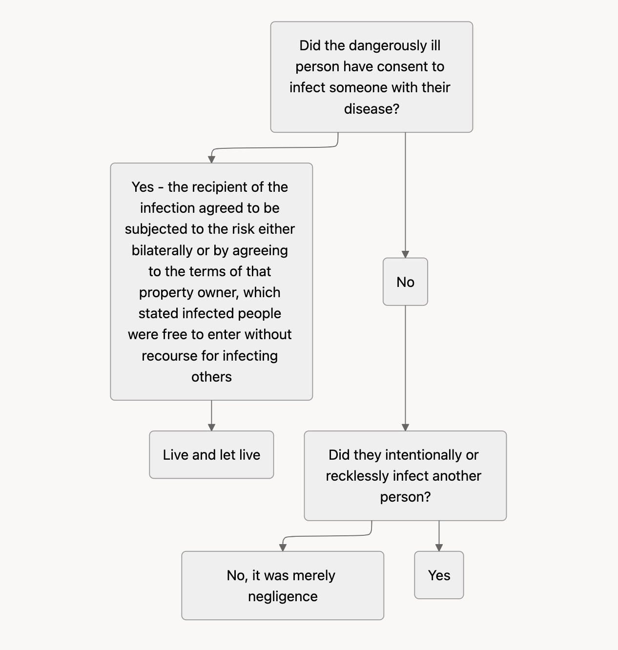 • A person with a dangerous contagious illness violates the Legal Principle by infecting another person who has not consented to the risk of being infected. It is the responsibility of the infected person to avoid infecting others or even creating a substantial risk to others.